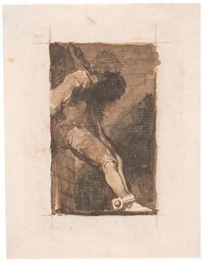 Esta obra se ha considerado un dibujo preparatorio de la estampa titulada Tan barbara la seguridad como el delito, en la que Goya muestra con crudeza a un reo encadenado. El grabado definitivo modifica en parte la composición y postura del personaje para mostrarlo más abatido, de ahí que Gassier considere el dibujo un mero ensayo de composición genérico para sus aguafuertes de prisioneros.
